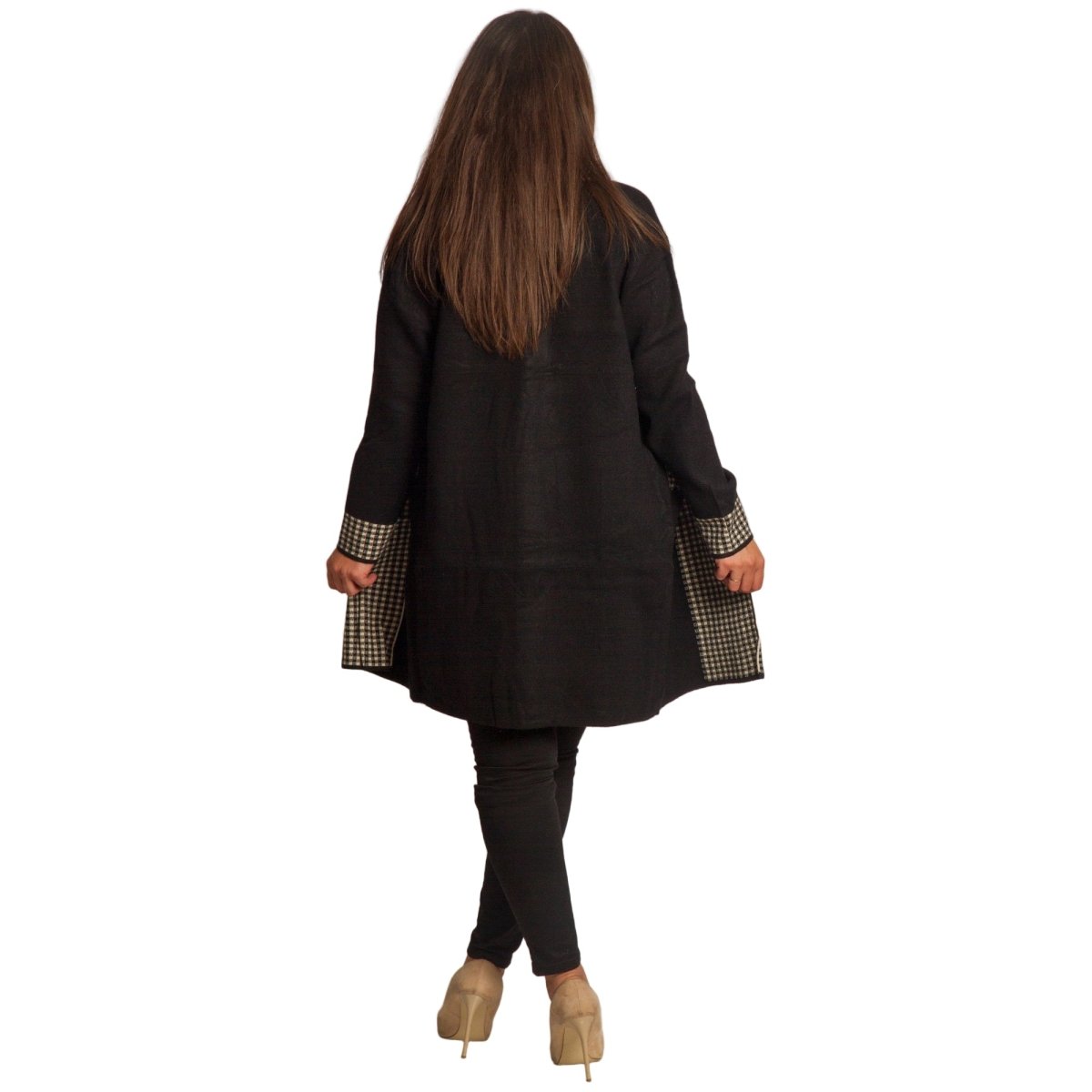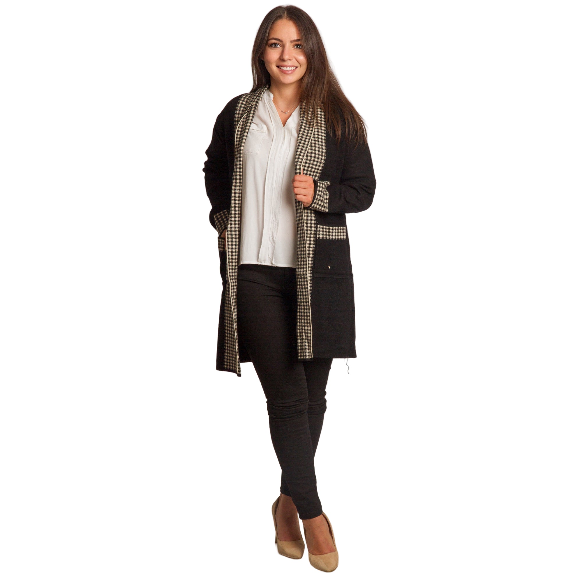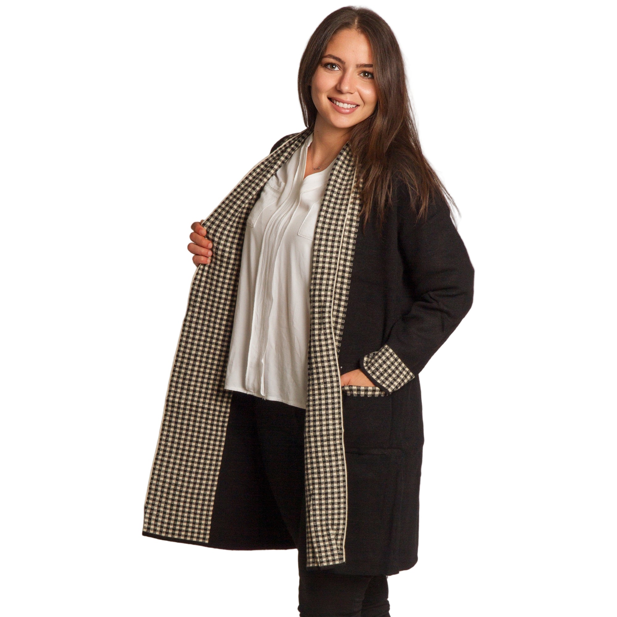 Елегантна и практична жилетка в големи размери, изработена от мека и удобна материя. Основният черен цвят е стилно допълнен с каре мотив по ръбовете, джобовете и маншетите, което придава изискан завършек. Жилетката е без закопчаване, с права кройка, осигуряваща комфорт и свобода на движение. Подходяща е както за ежедневни визии, така и за официални поводи през есенно-зимния сезон.