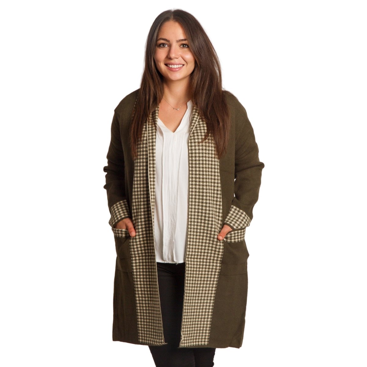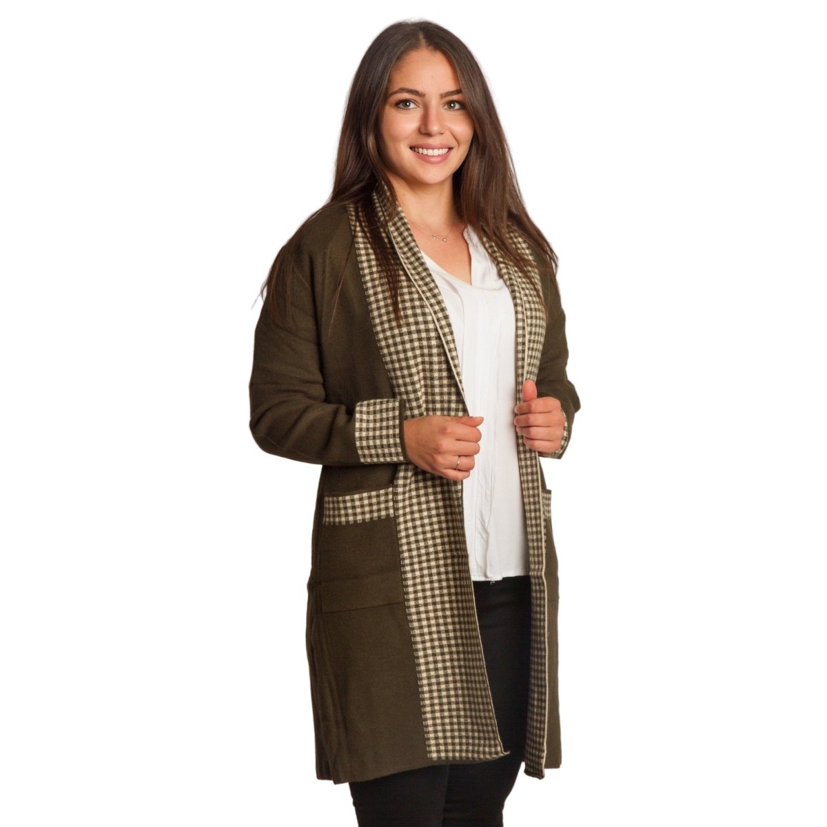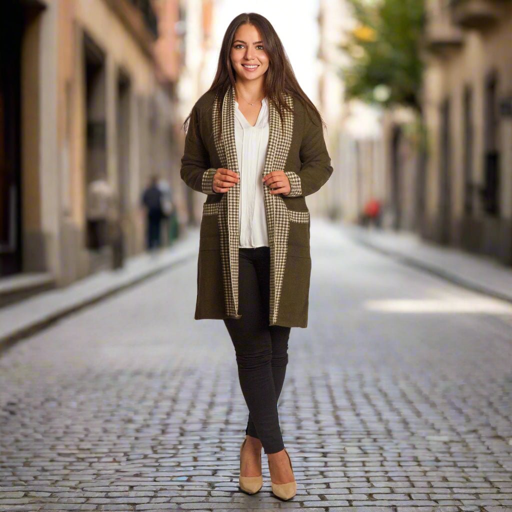 Елегантна и удобна жилетка в големи размери в стилен каки цвят. Декоративните каре акценти по ръбовете, джобовете и маншетите създават модерен контраст и придават изискано излъчване. Моделът е без закопчаване и с права кройка, което го прави подходящ за различни поводи – от ежедневни до официални. Материята е мека и еластична, осигуряваща комфорт при носене.