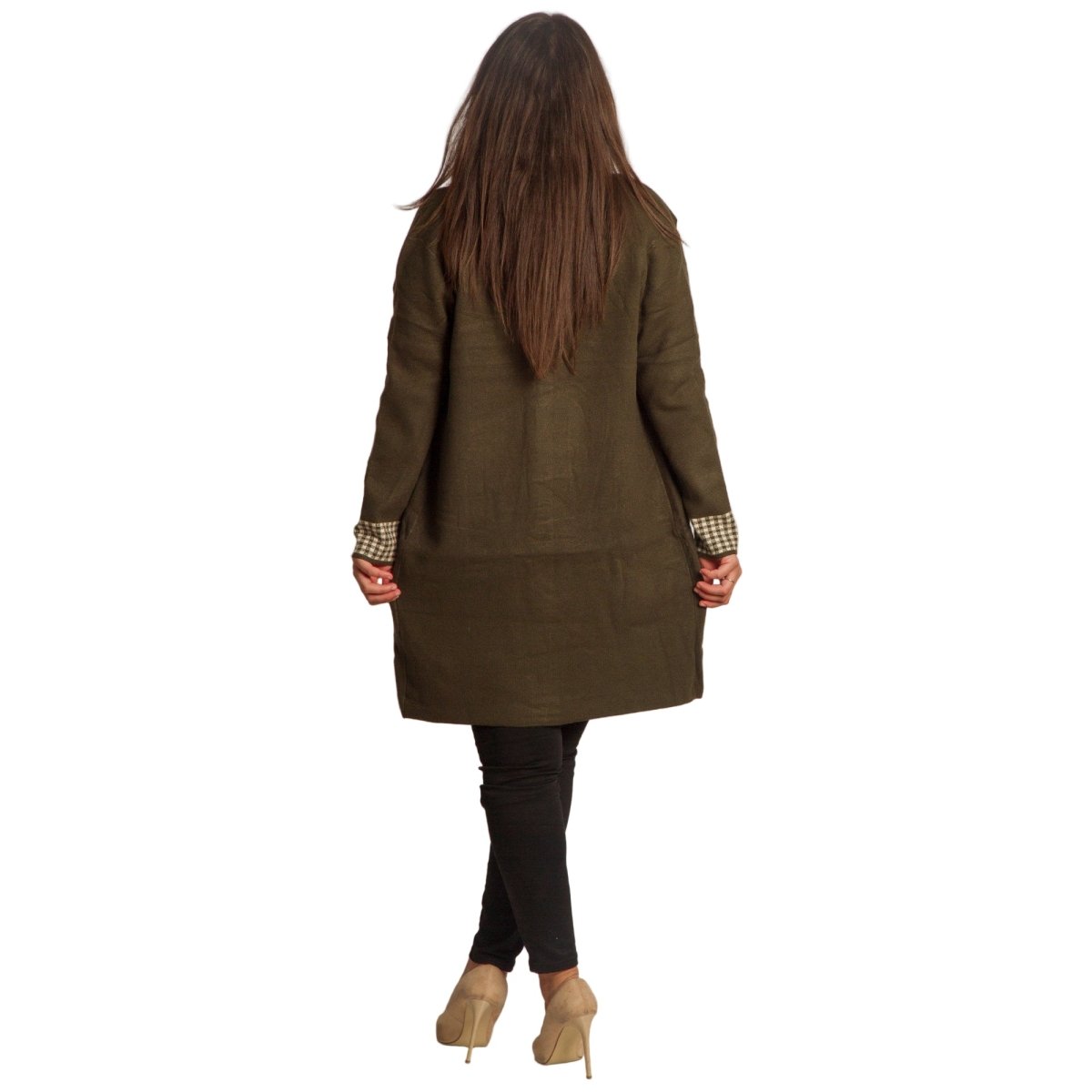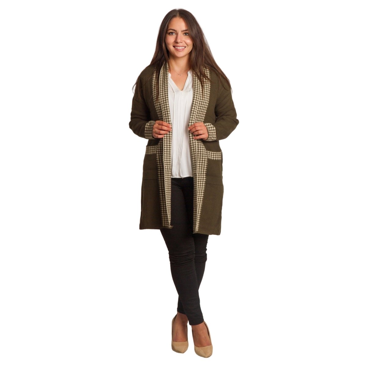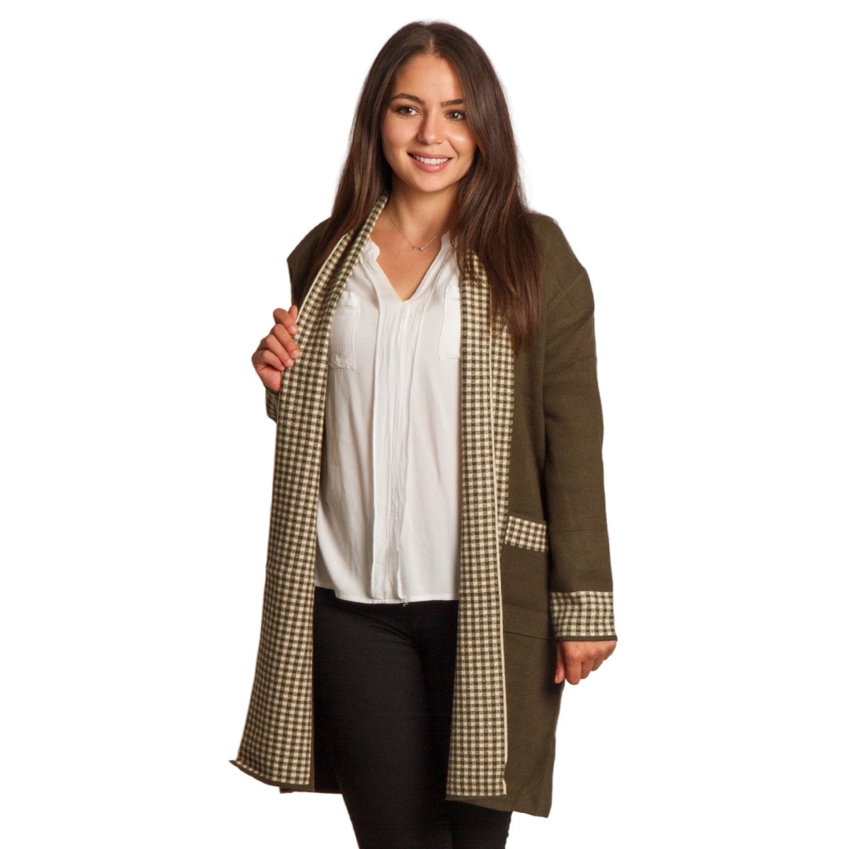 Елегантна и удобна жилетка в големи размери в стилен каки цвят. Декоративните каре акценти по ръбовете, джобовете и маншетите създават модерен контраст и придават изискано излъчване. Моделът е без закопчаване и с права кройка, което го прави подходящ за различни поводи – от ежедневни до официални. Материята е мека и еластична, осигуряваща комфорт при носене.