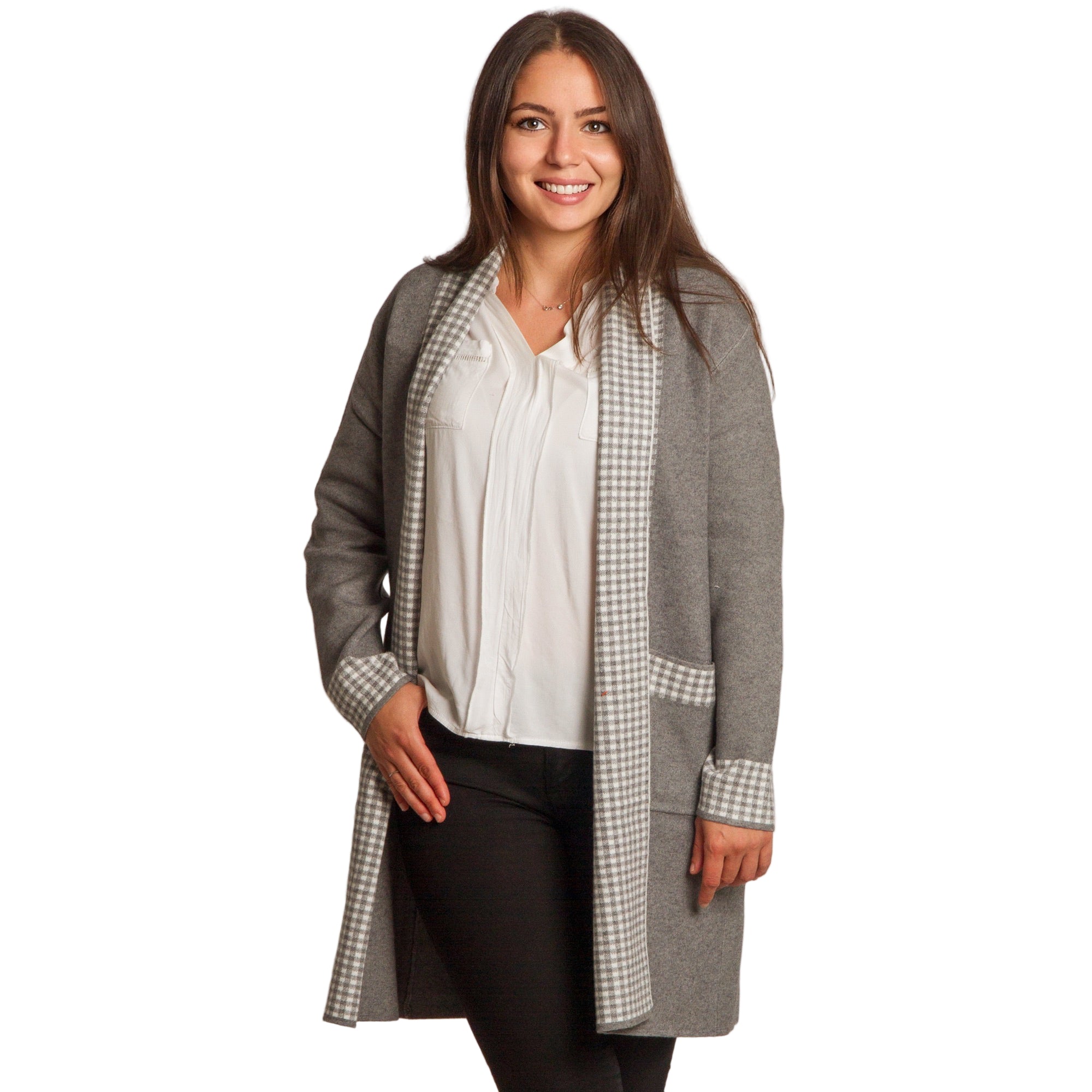 Стилна и универсална жилетка в големи размери, изработена в класически сив цвят с акценти от фино каре по ръбовете, джобовете и маншетите. Моделът е без закопчаване, с права кройка, която осигурява комфорт и свобода на движение. Подходяща е както за ежедневието, така и за по-елегантни поводи през есенно-зимния сезон.